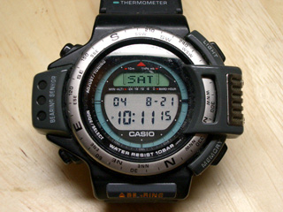 まだ「G Shock」なんてブランドがない時代に、所謂「山屋」で買った、気温・気圧・高度・磁気方位を測定できる時計。デジタルですけどね。高度表示は5m単位ですが、天候が急変しない限りかなり正確で、登山には重宝しました。ただし腕にはめていると体温で温度計が使えない。温度が変わると圧力センサの温度係数が大きくて気圧があてにならないという矛盾した製品です。最近は出番がないなあ。飛行機の中で客室が減圧される様子なんか見ていると楽しいです。