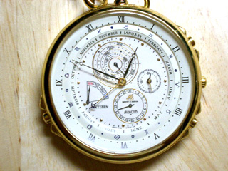 儀礼装用に買った「金の懐中時計」。たしか「完全無修正カレンダー」がついています。年・月・日・曜日をすべて針で指し示す仕組み。しかも過去と未来の100年間の日付を呼び出すことができます。役に立つのかどうかわかりませんが、これが既に2回逝っています。一回目は購入してすぐだったので無償修理でした。どうも曜日を指し示す針の往復機構が弱いみたい。上の2771も2100年2月28日までは無修正なのですが大丈夫でしょうか。