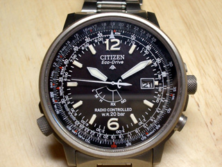 シチズンが発明して世界に広めた、「電波時計」です。しかも所謂「エコ・ドライブ」で電池不要。すなわち時々光を当てて、夜間窓際に置いとけば完全メインテナンスフリーという究極の時計です。ベゼルの外周が黒くメッキしてあるものも出ていますが、これの方がsolidな質感がわたしの好みにあっています。航空用計算尺つき。これはさすがに目盛り精度いいですね。でもストップウォッチなんかはついていません。ベゼルとベルトはチタン。電波時計にありがちなアンテナ部分の樹脂カバーはありません。シチズンすごい! でも壊れたりしないかなあ。というのも、
