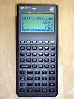なお、私、関数電卓は以下のHP48GXを使用しております。普通の関数はもちろん、3次元のグラフ、統計、ヴェクトルと行列、文字処理、定積分および簡単な不定積分、FFTなど、尋常ではない機能を持っているスグレモノです。そのむかし関数電卓は「69の階乗」の演算の速さでその性能を測ったもんです。69!は通常の電卓が扱える9.999999E99を越えない最大の階乗値であります。ほとんど瞬時に答えを返すシャープの某製品が出たときなど、予めマシン定数として69の階乗を記憶させているのではないかなどという噂がまことしやかに流れたもんです。ところがこの電卓、速度はいまいちですが、なにしろ1E500まで扱えるので、70の階乗も楽々計算し、なおかつ実は単なる階乗ではなくてガンマ関数なので、105.2の階乗なんてのも計算してくれるのです。すごい。アメリカでは大学受験する高校生が使うらしいですけどね。オペランドを入力してからオペレータを指定する、所謂「逆Poland方式」。その前のHP28から通算するともう15年くらい使っています。しばらく前から普通の電卓は使えなくなってしまいました。人に貸しても使えないと言われるし、困ったもんです。:-) ずいぶん前に後継の49が出ていますが、いまのところ48で充分。膨大な数の愛好家のサイトが世界中にあるようです。