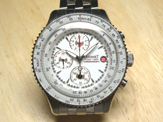 時計コレクタの間では力一杯軽蔑される「パチモン」だそうです。大体「定価」の9割引と称して売っていましたからね。:-) ブランド名のPierre Guionnet氏は「フランスの若き天才デザイナー」だそうですが、Google.frなんかで検索しても全く出てきません。2ちゃんねるのカキコによれば「ピエールさんの中の人は台東区上野にあるウエニ貿易 第二事業部 時計営業課 吉田宗一さん でつ。 ロレやオマガの並行輸入なんかで稼いだ金を ピエールさんやSONNEといった9800円ブランドで 還元している!?良心的な商社です。」とのことです。パチモンにしてはベゼル、ガラス、バンドなど、質感は高級だし、白地に赤の日付表示もなかなかセンスいいですね。でも肝心の運針精度と航空用計算尺の目盛り精度は全然ダメで、見かけ倒しと言えましょう。まあそれを言ったらそもそも時計に計算尺つけているのがそもそも見かけ倒しなんですが、なんちゃって。ストップウォッチとしては結構使えます。