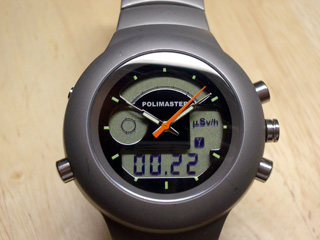 これがキワモノのとどめですかね。ベラルーシBelarusのPOLIMASTER社が製造している腕時計型γ線量計です、というか腕時計と線量計の合体したもの。自然放射線なんかを測る低線量タイプです。なにしろかのジェーシーオー事故の時には屋内待避命令を食らった地域に住んでおりますので、こういうものは必需品かと思いまして。(事故の時は別の線量計で測っていましたけどね。当日の夜の雨の時にはたしか通常の50倍くらい計数してましたね。) 普段はあまり使い道がありませんが、飛行機に乗るとき、上空の放射線量(地上より数倍高い)を測って同僚に見せたりするとビビルので面白い。なお、市民でも買える比較的安価な線量計は結構売っているので、その手の施設の周辺にお住まいの方は持っていても良いのではないでしょうか、まじめな話。