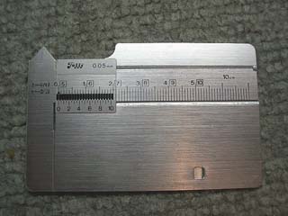 カードノギス「ど〜のくらい」 東洋計器株式会社。 キャッシュカードサイズのノギスです。厚さ1mmくらいの硬質樹脂製。いつも手帳に入れて携帯しています。外寸内寸深さがちゃんと0.05mm単位で測れます。副尺に工夫があって、透明の板に副尺目盛りが黒地抜きで印刷してあり、副尺目盛りと主尺目盛りが一致したところで副尺目盛りが見えなくなるようになっています。1990年頃買いましたが、重宝しています。